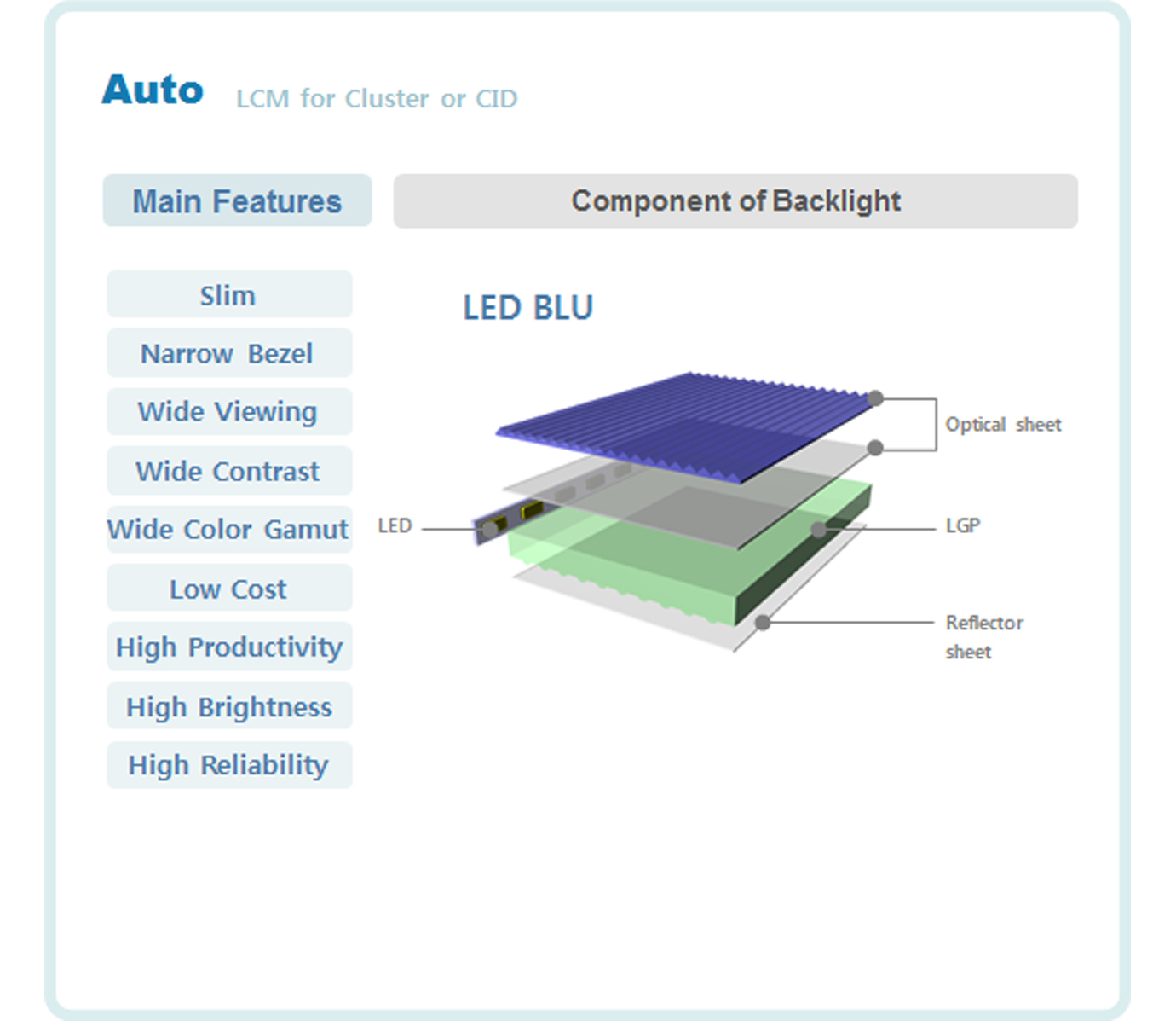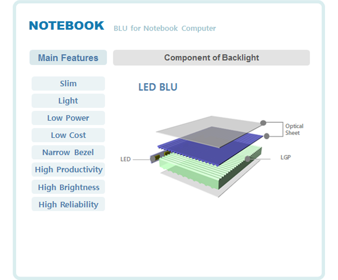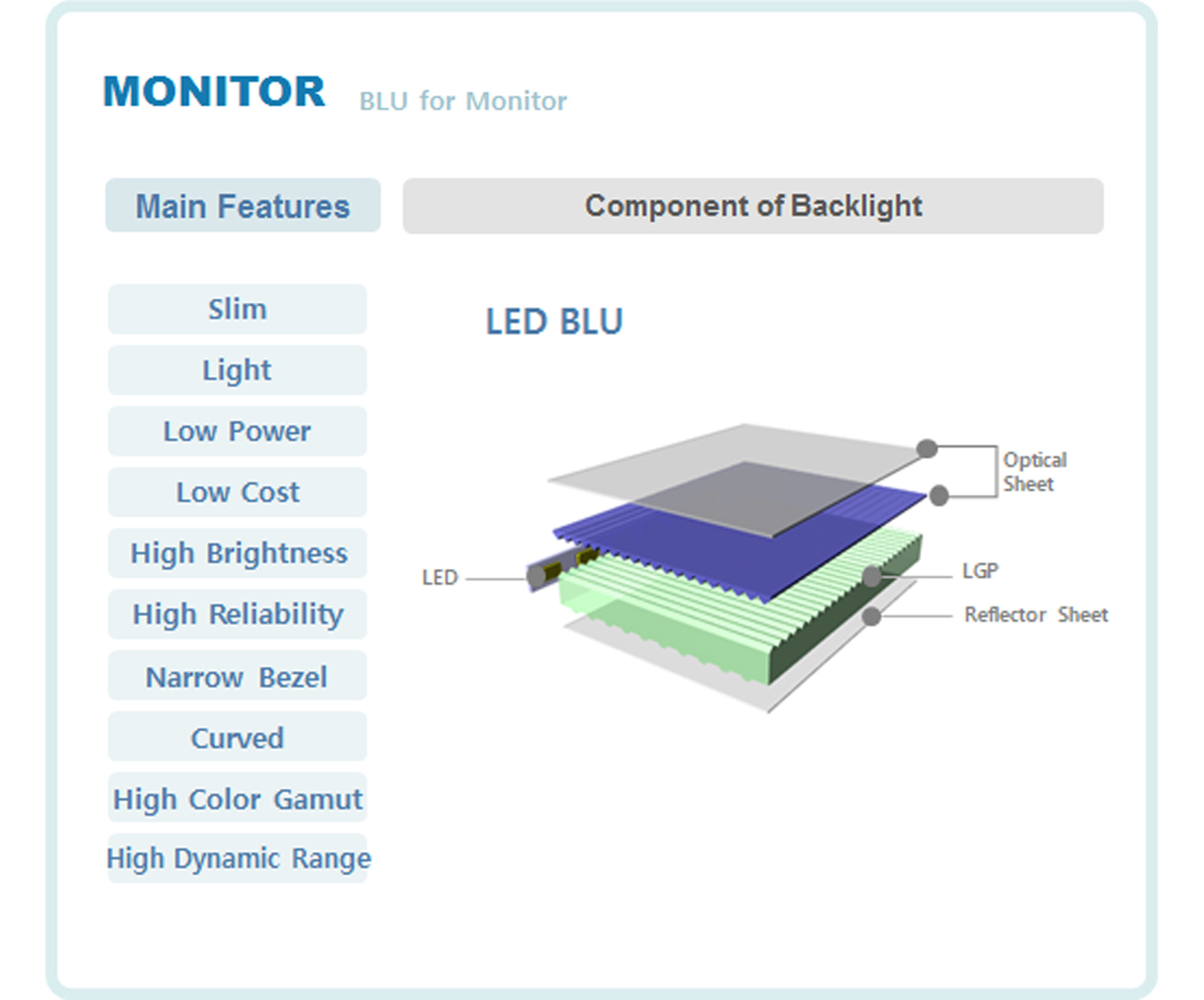 Located in the back of the liquid crystal panel, which has no self-luminescent capabilities, BLU is luminous equipment that emits uniform planar light in the direction of the panel.