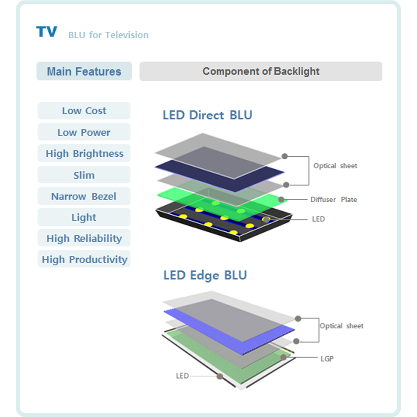 Types: categorized into Edge Type, where the light source is located on the side of the Light Guide Plate, and Direct Type, where the light source is located on the bottom of the Diffuser Plate.